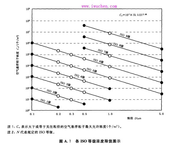 圖 A. l 是表 1空氣潔凈度等級(jí)的圖示 ,僅起說(shuō)明作用 。表 1的 ISO 等級(jí)在圖中以直線表示 ,直線代表關(guān)注粒徑閾值所對(duì)應(yīng)的等級(jí)濃度限值 。這些限值是根據(jù) 3. 2 中的式(1) 計(jì)算得來(lái) 。而圖中的直線 只是等級(jí)限值的一種近似表示 ,不能以此確定限值,確定限值仍使用式 ) 。